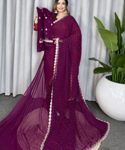 এই জাম কালারের শাড়ি টি ইন্ডিয়ান ওয়েটলেস সফট জর্জেট ফ্যাব্রিক দিয়ে তৈরী করা এবং সম্পূর্ণ শাড়ির আঁচল ও বর্ডার জুড়ে কনট্রাস্ট লেইস ওয়ার্ক এটিকে আরও আকর্ষণীয় করে তোলে এবং যেকোনো বিশেষ অনুষ্ঠানের পরিধানের জন্য উপযুক্ত।