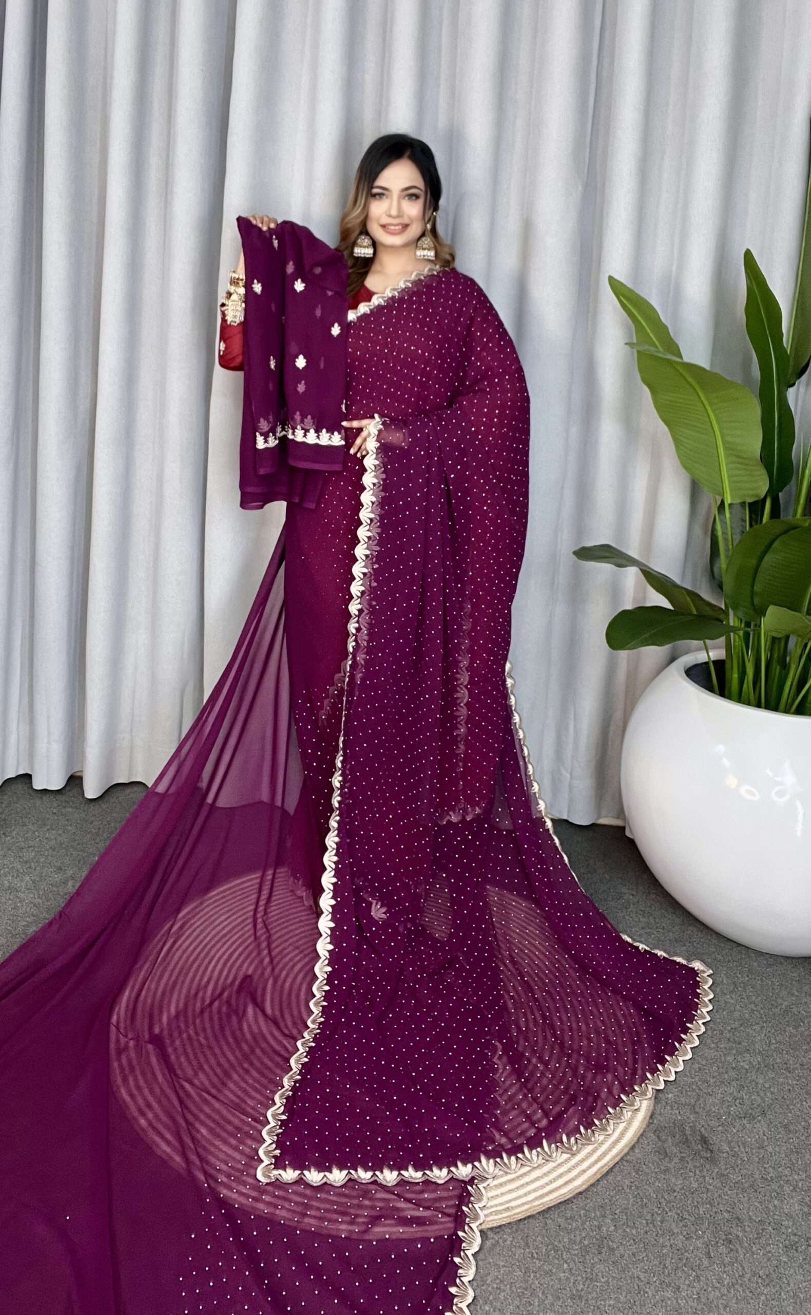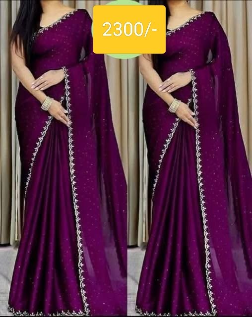 এই জাম কালারের শাড়ি টি ইন্ডিয়ান ওয়েটলেস সফট জর্জেট ফ্যাব্রিক দিয়ে তৈরী করা এবং সম্পূর্ণ শাড়ির আঁচল ও বর্ডার জুড়ে কনট্রাস্ট লেইস ওয়ার্ক এটিকে আরও আকর্ষণীয় করে তোলে এবং যেকোনো বিশেষ অনুষ্ঠানের পরিধানের জন্য উপযুক্ত।